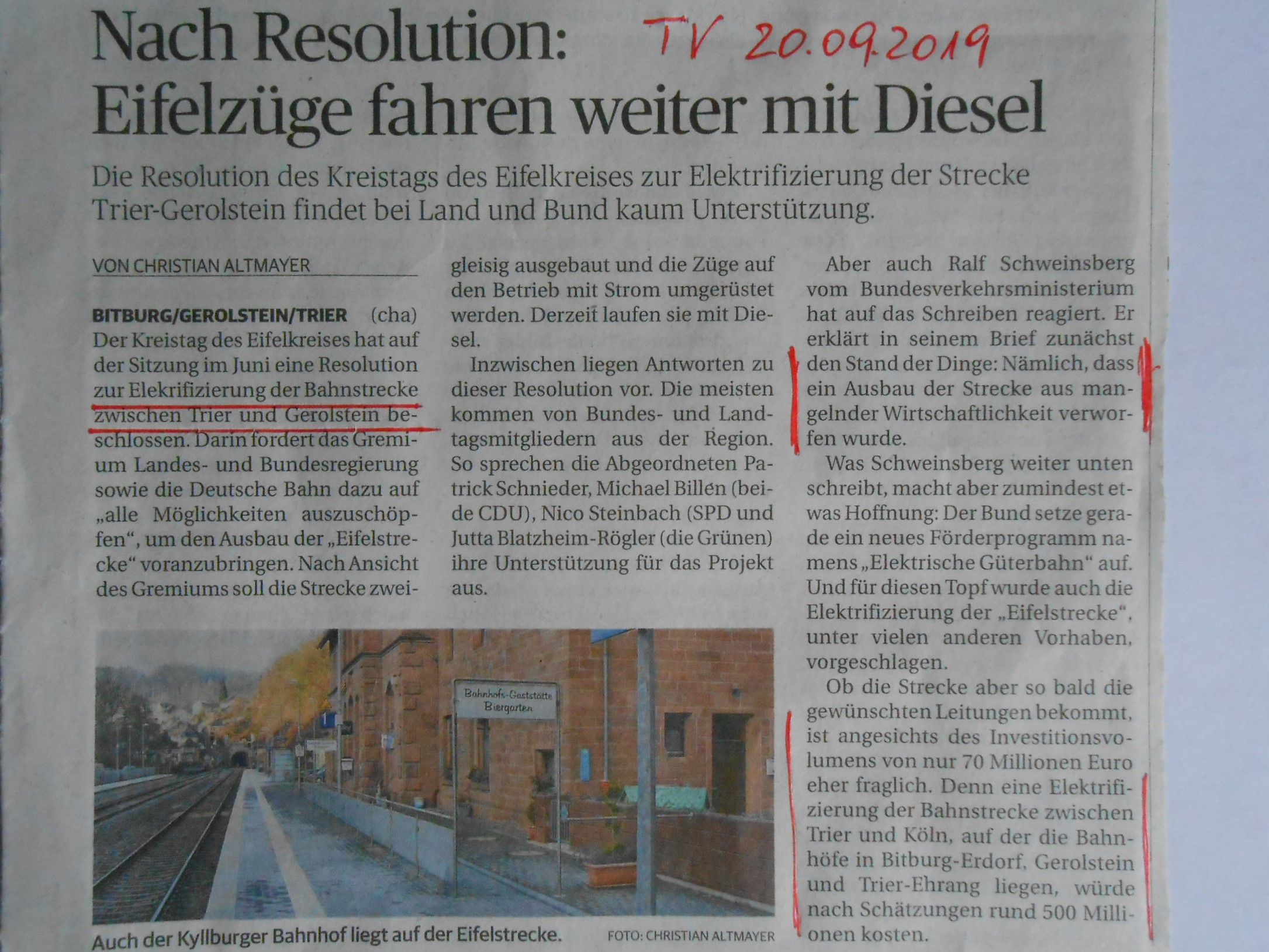 In dem TV-Bericht vom 20.09.2019 wird nochmals die Aussage eines Vertreters des Bundesverkehrsministeriums publiziert, der zweifelsfrei und eindeutig erklärt, dass "ein Ausbau der Strecke (Anmerk.: also "Eifelstrecke") aus mangelnder Wirtschaftlichkeit verworfen wurde"